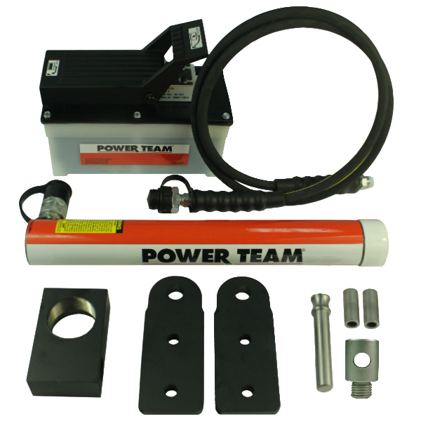 - Includes all of the mounting brackets, a 10-Ton hydraulic cylinder, a 10,000 PSI air/hydraulic pump, and a 10,000 PSI hose with quick-disconnect couplings