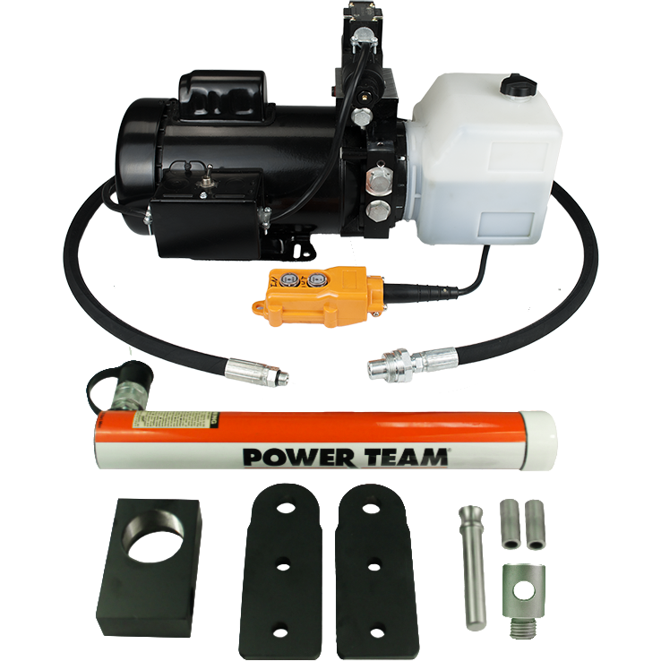 - Includes all of the mounting brackets, a 10-Ton hydraulic cylinder, a 4,000 PSI electric/hydraulic pump, and a 10,000 PSI hose with quick-disconnect couplings